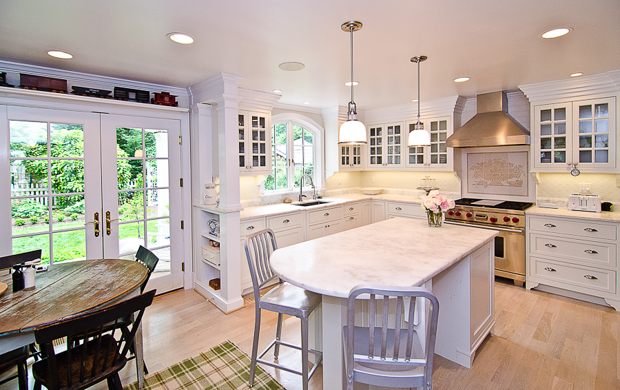Though not officially part of the addition, walls for what was formerly a utilitarian kitchen were bumped out two feet, and Montgomery Kitchen and Bath was called in to partner in Callison’s warm country kitchen-style transformation. Punctuated by soft, recessed lighting, pendant lights, strong molding and fine design details such as drawer pulls in the form of clock faces, a decorative laser-carved tile element behind the stove was created by Bethesda’s Bartley Tile Concepts.